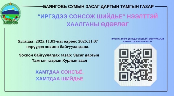 "Иргэдээ сонсож шийдье" нээлттэй хаалганы өдөрлөг 11 сарын 03-07-ны өдрүүдэд болж байна.