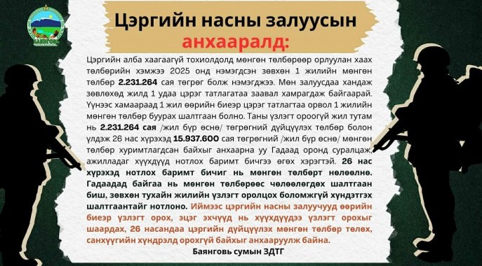 ХУГАЦААТ ЦЭРГИЙН АЛБА ХААЖ БУЙ ЦЭРЭГ ДАЙЧДАА ЭРГЭЛЭЭ.