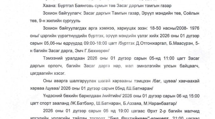 БАЯНГОВЬ СУМЫН 2026 ОНЫ ЦЭРГИЙН ТОО БҮРТГЭЛЭЭР ЗОХИОН БАЙГУУЛАХ АЖЛЫН ХӨТӨЛБӨР, УДИРДАМЖ